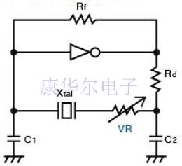 為了確認(rèn)振蕩電路的振蕩余量是否足夠,需要知道振蕩電路的負(fù)電阻(-R).插入與晶振單元串聯(lián)的可變電阻器(VR),并從振蕩停止?fàn)顟B(tài)更改到振蕩開始為止的值.振蕩開始時(shí)的VR值變?yōu)樨?fù)電阻值(-R).為了獲得足夠的振蕩電路的振蕩余量,請(qǐng)調(diào)整C1,C2和Rd,以使負(fù)電阻值至少為石英晶體振蕩器單元有效電阻值的5倍.此外,當(dāng)用于車載等高度可靠的設(shè)備時(shí),建議使用10次以上.