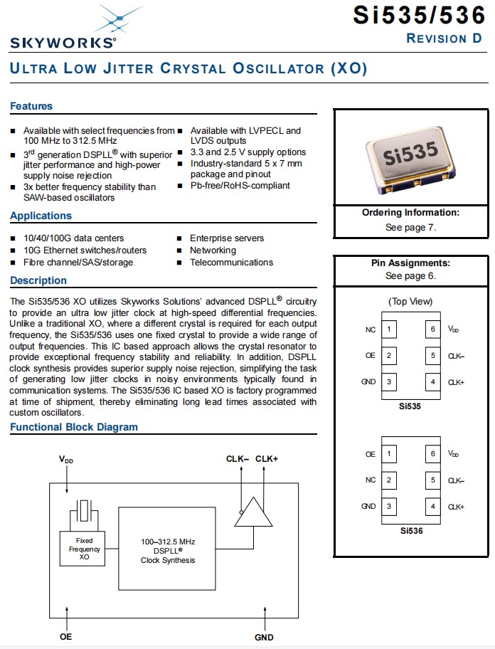 特點:可選擇頻率從100兆赫到312.5兆赫,第三代DSPLL®具有優(yōu)越的抖動性能和高功率電源噪聲抑制,比基于saw的振蕩器好3倍的頻率穩(wěn)定性,可用LVPECL和LVDS輸出差分晶振,3.3和2.5V供應選項,工業(yè)標準7.0x5.0毫米包和針形,無鉛/rohs兼容